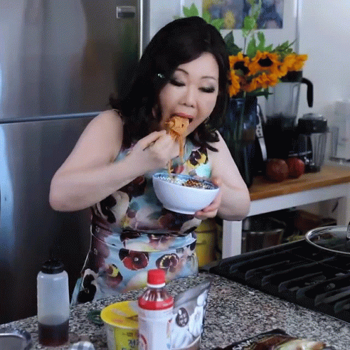 Emily Kim, wearing a floral dress, enthusiastically eats a delicious meal of noodles from a white bowl in her kitchen.