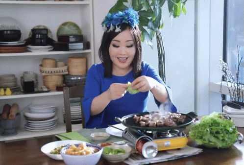 Emily Kim enjoying a delicious Korean BBQ meal, taking a bite of a lettuce wrap with grilled meat.