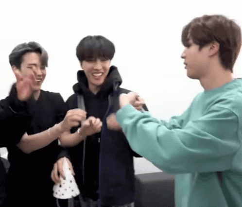 BTS members Jin and Jimin share a playful, friendly moment, holding hands while J-Hope smiles in the background.