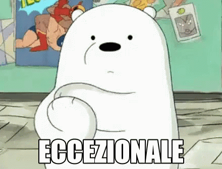 Ice Bear from We Bare Bears expresses approval with a gesture, accompanied by the word 'Eccezionale'.