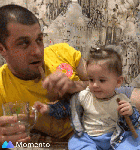 Man in yellow shirt holds a baby, sharing a moment with a glass and chocolate bar.