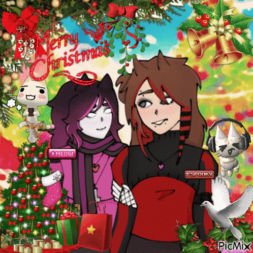 a merry christmas greeting card with two anime girls