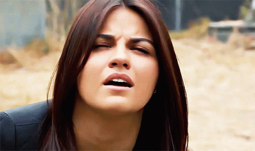 Maite Perroni shows a concerned or surprised expression, looking upwards with furrowed brows in a close-up shot.