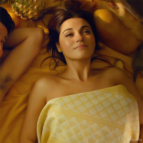Maite Perroni relaxing on a yellow bed, wrapped in a towel, with fruits nearby.