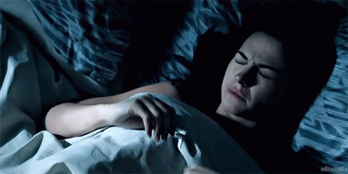 Maite Perroni as Alma Solares lies in bed, eyes closed, in a scene from 'Oscuro Deseo'.