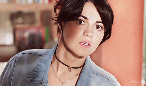 Maite Perroni in a denim jacket and choker necklace, looking intently at the camera with an expressive gaze.
