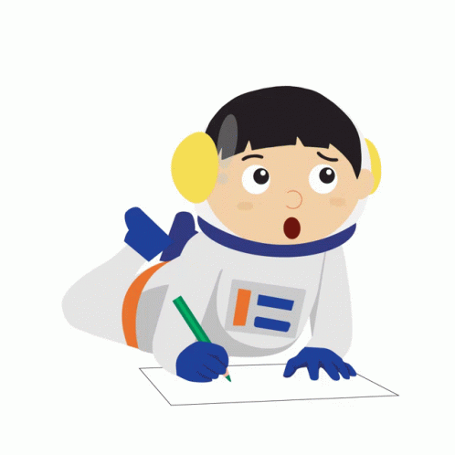 Eduwis boy in an astronaut suit lies on his stomach, drawing with a green pencil, looking confused.