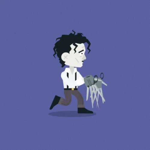 An animated character resembling Edward Scissorhands stands, holding his unique scissor hands.