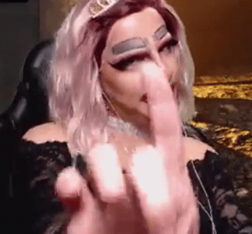 Eevo Eevolicious, a drag queen, reacts dramatically with a finger gesture, wearing a wig and crown.
