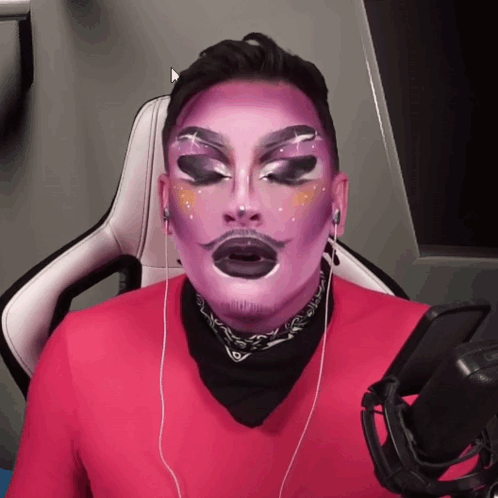 Eevoh, wearing elaborate purple makeup, reacts with a wide-eyed, surprised expression.