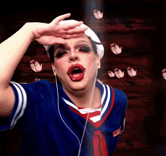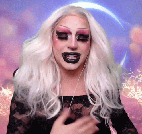 Eevolicious, a drag queen with white hair and dramatic makeup, performs with intense emotion.