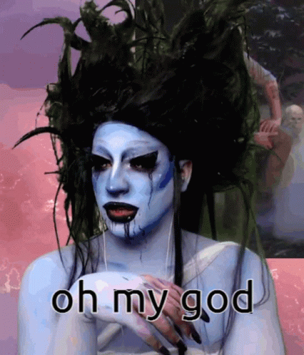 Eevolicious reacts with a shocked 'oh my god', featuring striking blue face paint and dramatic makeup.