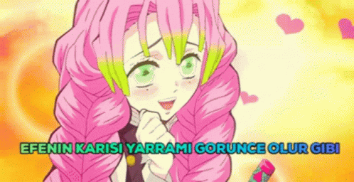 Mitsuri Kanroji from Demon Slayer, with pink hair and green eyes, reacting with hearts in an anime scene.