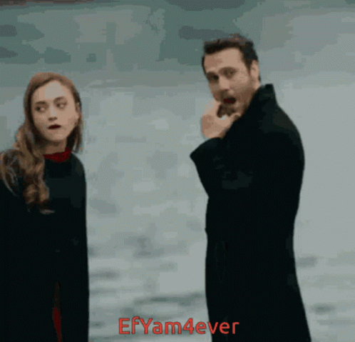 Efsun and Yamaç from Çukur share a surprised then smiling moment, captured with the EfYam4ever watermark.