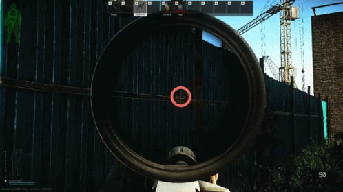 a sniper scope in a video game with a red circle in the center