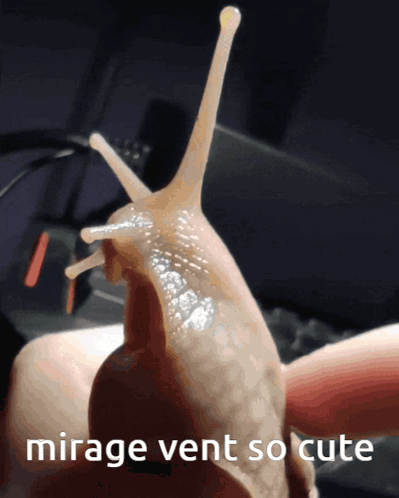 A cute snail with long antennae being gently touched, with text 'mirage vent so cute' overlaid.