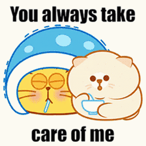Egg Yolk Cat and Happy Kitty in a heartwarming scene, with the message 'You always take care of me'.