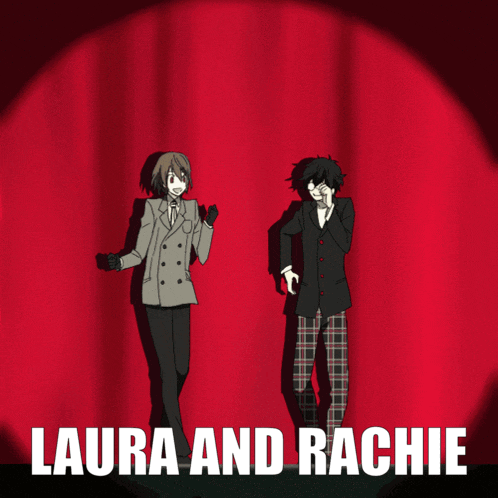Goro Akechi and another Persona 5 character dance on a red stage, featuring Laura and Rachie.