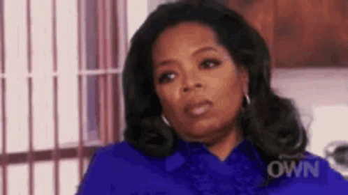 Oprah Winfrey looks annoyed, wearing a blue shirt and earrings, with an 'egh' expression.