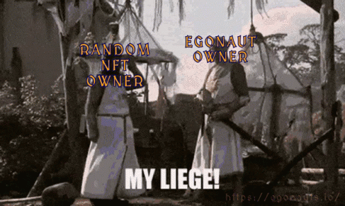 Random NFT owner kneels before an Egonaut owner, declaring 'My Liege!' in a Monty Python-inspired crypto meme.