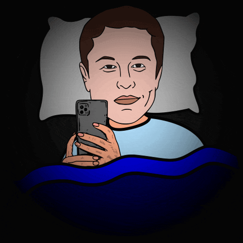 Cartoon of Elon Musk in bed, holding a phone, with 'GOODNIGHT SWEETDREAMS' text.