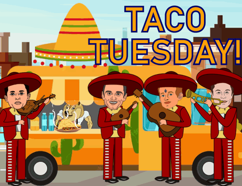Cartoon mariachi band featuring Elon Musk, Gary Vaynerchuk, and Vitalik Buterin celebrates Taco Tuesday with Doge.