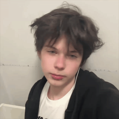 Egor Planger, a cute boy, looks at the camera, wearing a black jacket and white t-shirt.