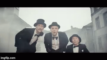 Egor Kreed and two other gentlemen in suits and bowler hats stand in a foggy street.