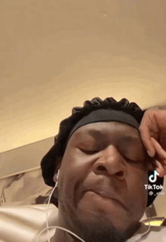 Ehiz from Stan Twitter trying to hold back laughter while wearing headphones and a hat.