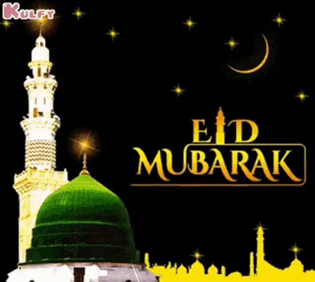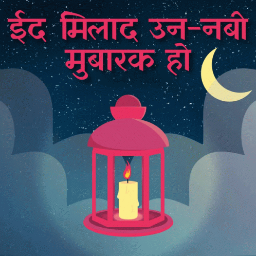 A festive image for Eid Milad Un Nabi featuring a lit lantern, crescent moon, and starry night sky.