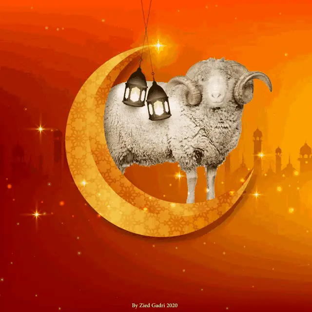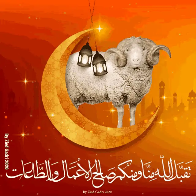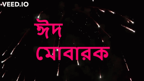 A vibrant fireworks display celebrates Eid Mubarak, featuring the greeting in Bengali script.
