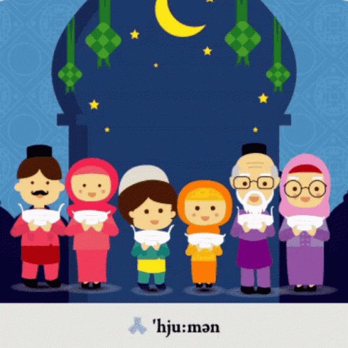 Cartoon family celebrating Selamat Hari Raya Aidilfitri with masks, ketupat, and a crescent moon.