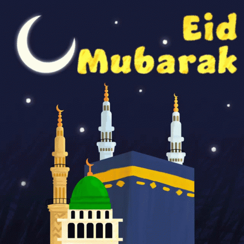 An animated Eid Mubarak greeting featuring the Kaaba, a mosque with a green dome, a crescent moon, and stars.