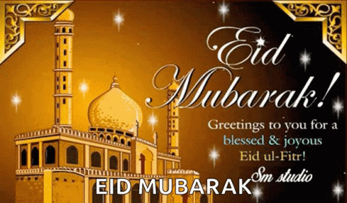 A festive animated greeting card wishing 'Eid Mubarak' and 'Eid ul-Fitr', featuring a golden mosque.