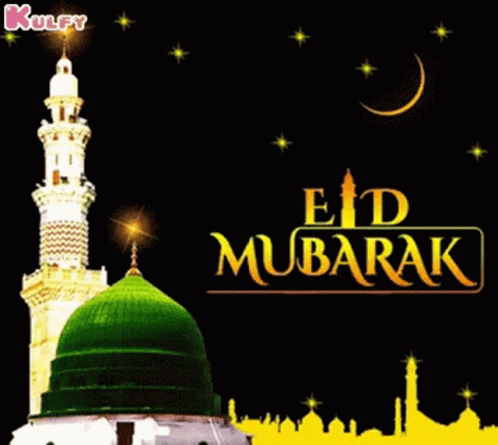 A beautiful Eid Mubarak greeting card featuring a mosque, minaret, crescent moon, and stars.