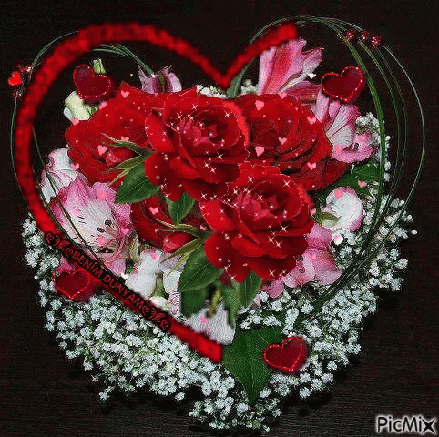 A heart-shaped bouquet of red roses and pink flowers with glitter, celebrating Eid Mubarak.