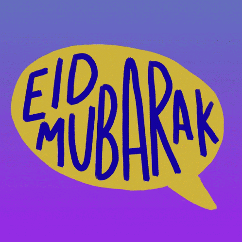A vibrant yellow speech bubble displays 'Eid Mubarak' in blue text, celebrating the festive occasion.