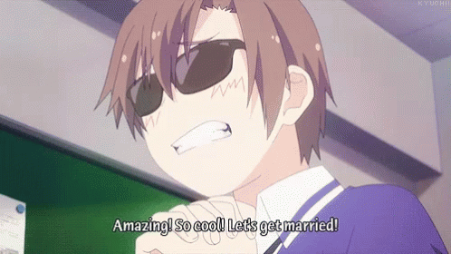 Eita from Oreshura, wearing sunglasses, exclaims 'Amazing! So cool! Let's get married!' with an excited expression.