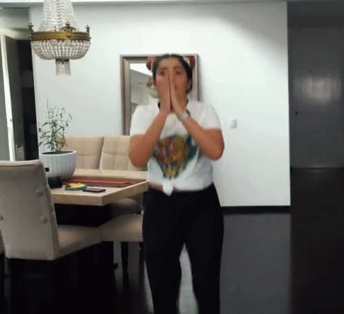 Lesslie Polinesia doing cardio exercises and squats in a home dining area.