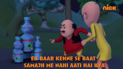 Motu is questioned by Patlu, asking if he doesn't understand things when told once, from the cartoon Motu Patlu.