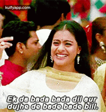 Kajol smiling and gesturing, singing "Ek da bada bada dil" from the iconic Bollywood movie Kabhi Khushi Kabhie Gham (K3G).