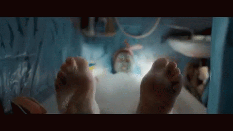 Alisa in a bathtub, recreating a scene from the 'Экспонат' music video, with a face mask and rubber duck.