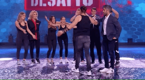 Emotional group hug on the stage of the Spanish TV show El Desafío, celebrating camaraderie and farewells.