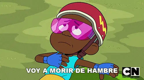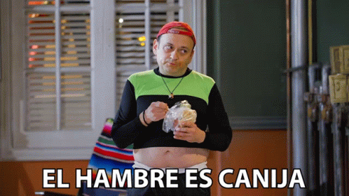 German El Portero from Vecinos expresses 'Hunger is fierce' while holding a small bag of food.