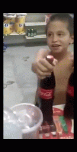 A young boy excitedly opens a Coca-Cola bottle in a store, celebrating the moment.