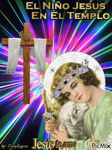 Animated image of the Child Jesus in the Temple, holding a lamb, with a cross and colorful rays.