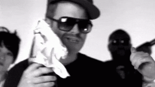 El P from Run The Jewels holds a bottle resembling a Molotov cocktail, with a figure holding a rifle in the background.