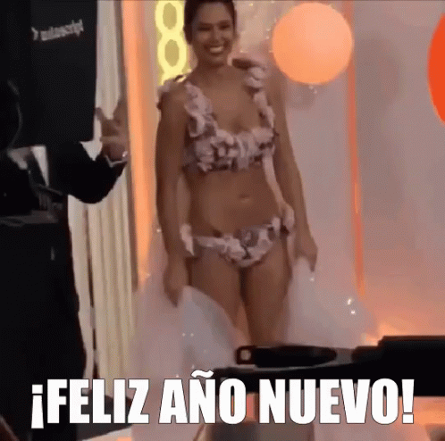 Cristina Pedroche in a floral bikini, celebrating New Year's Eve with a festive message.