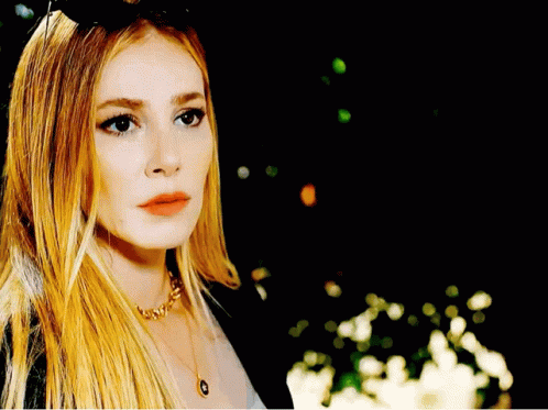 Elçin Sangu with a pensive and sad expression, featuring her long blonde hair and gold necklace.