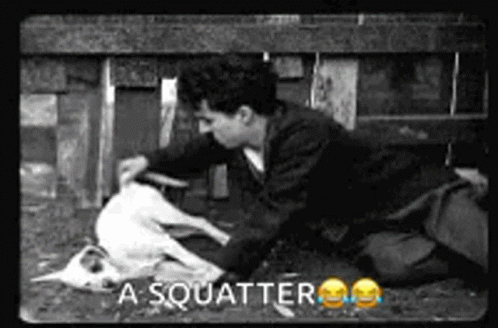 Charlie Chaplin, as his iconic tramp character, pets and then sleeps beside a dog, with the caption 'A SQUATTER'.